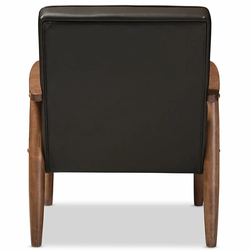 A simple, post-modern design that works well with a variety of styles, the Sorrento lounge chair is upholstered in faux leather with solid rubberwood legs and frame. The sculptural arms and wide, welcoming seat are a throwback to classic 1950s and 60s Danish design. A fully upholstered seat with exposed dark walnut wood looks great from all angles, whether in a lounge arrangement, public waiting area or private office. The splayed legs and button-tufting design add a retro modern touch to this piece of clean lines furniture. The Sorrento also features light weight and easy handling. It will be suitable for those urban dwellers with limited space. It could be a cool-looking reading nook within 30 minutes of assembly out of a box. Made in Malaysia, the Sorrento will be a standout piece in any modern interior.